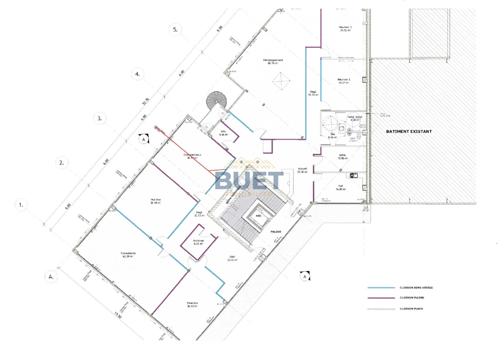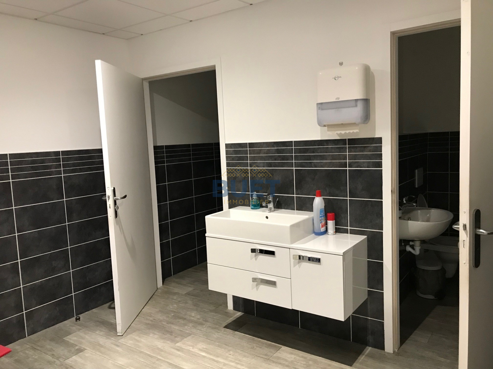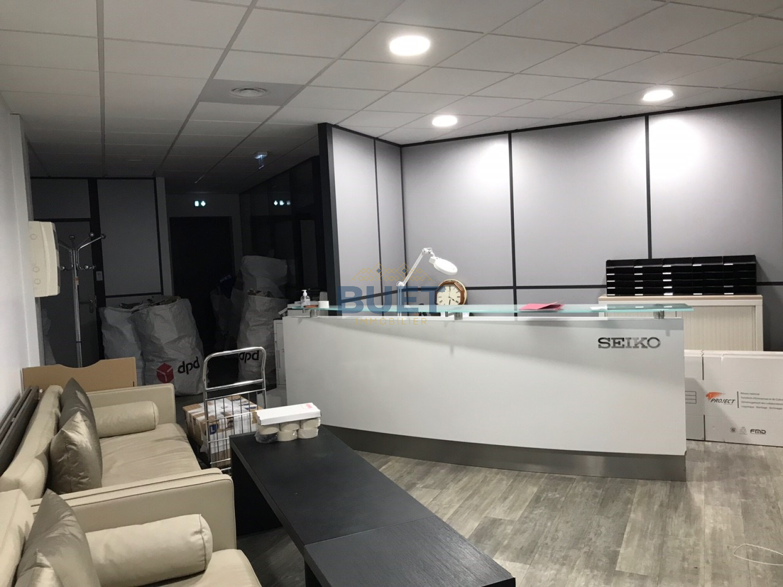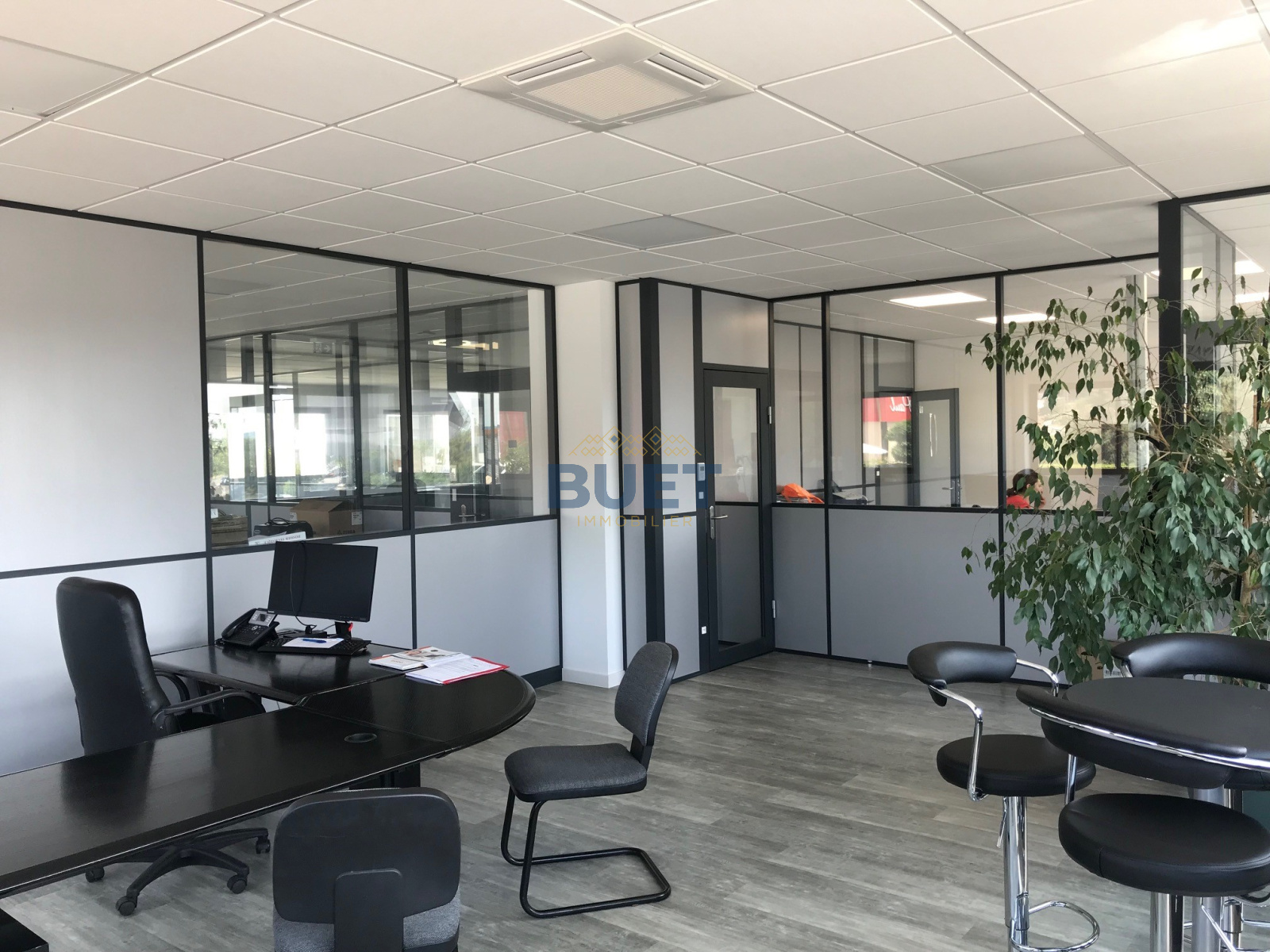 Sol thermoplastique, faux plafond avec luminaire LED, climatisation réversible, sanitaires privatifs, cloisons intérieures semi-vitrées.
