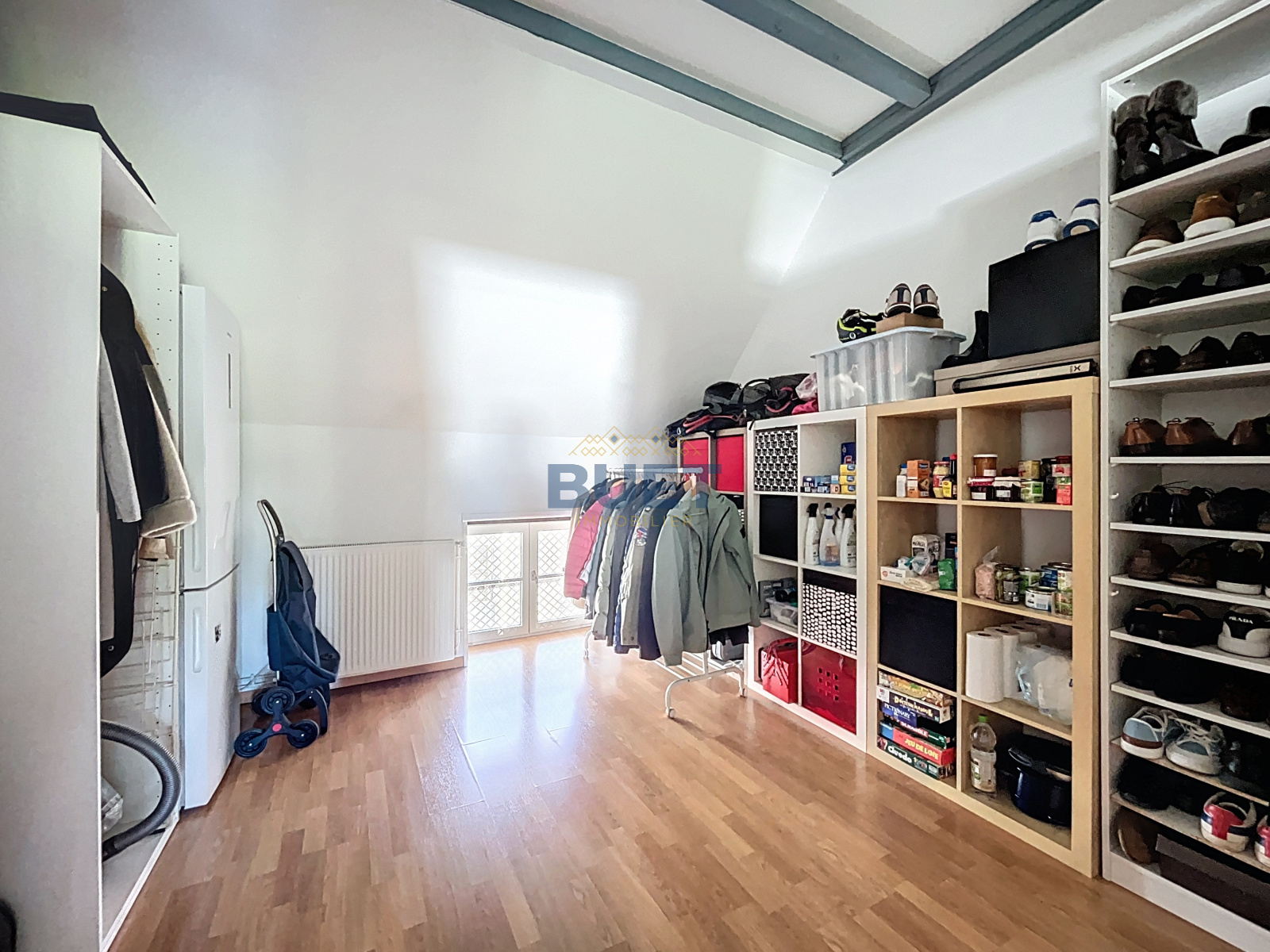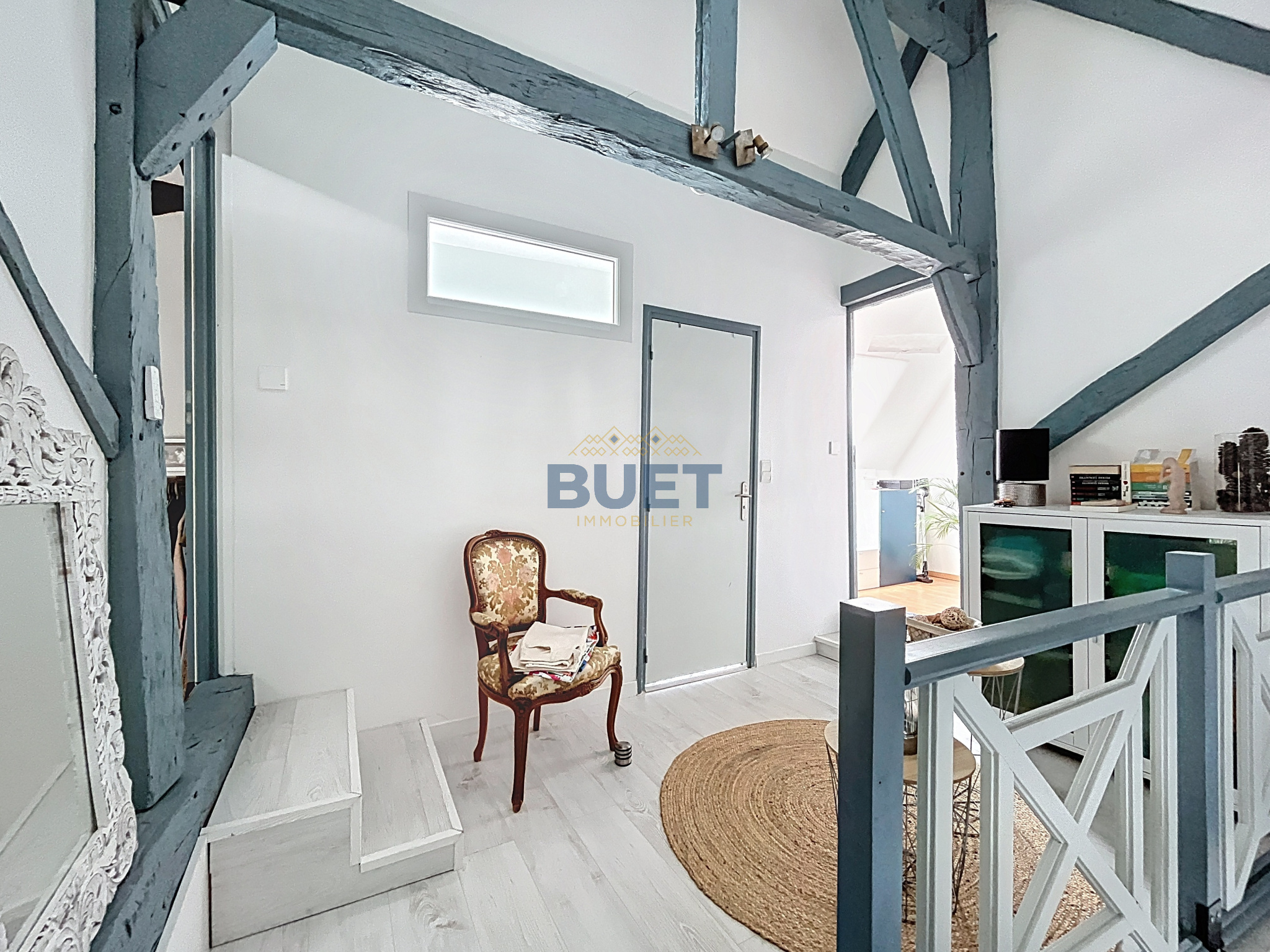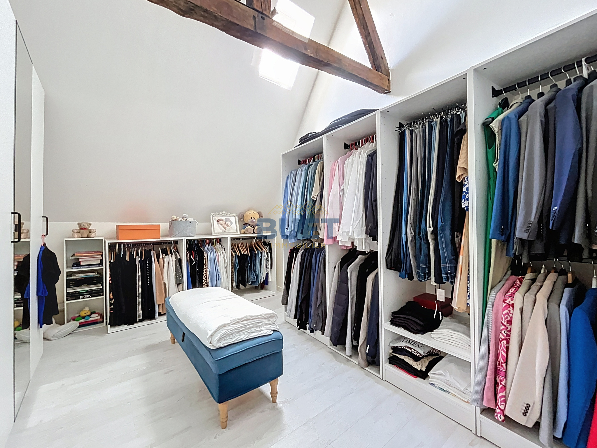 À l’étage, deux chambres, dont une aménagée en dressing, ainsi qu’une salle de bains avec WC.