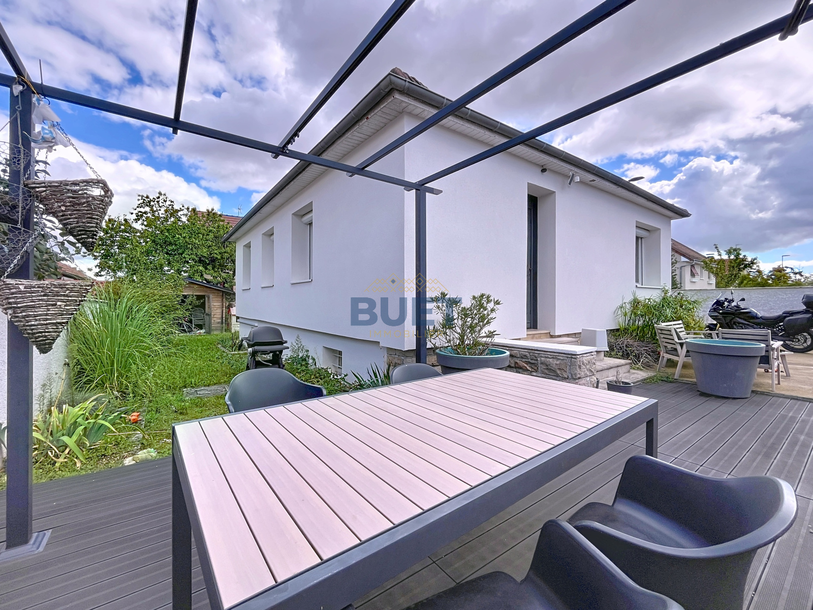 À l’extérieur, le jardin clos et la terrasse avec pergola offrent un cadre de vie agréable et intime.